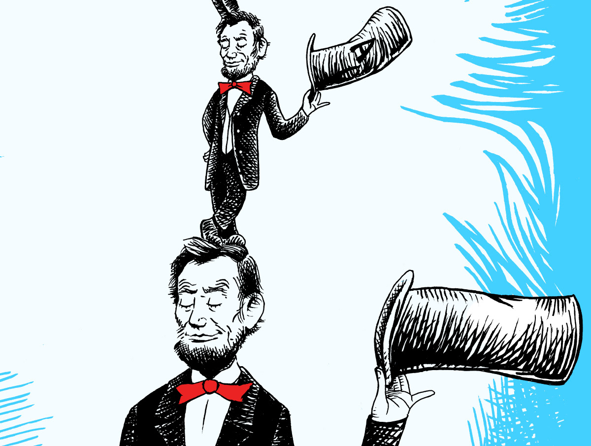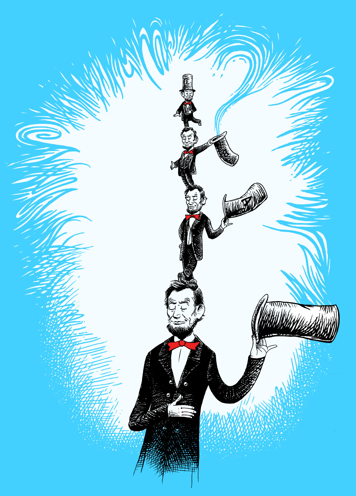 Created in the style of the singular Theodor Seuss Geisel, this drawing might just explain how Lincoln accomplished so much during his short tenure as president of the United States. Mr. Lincoln happily tips his hat to reveal little Abes A, B and E.