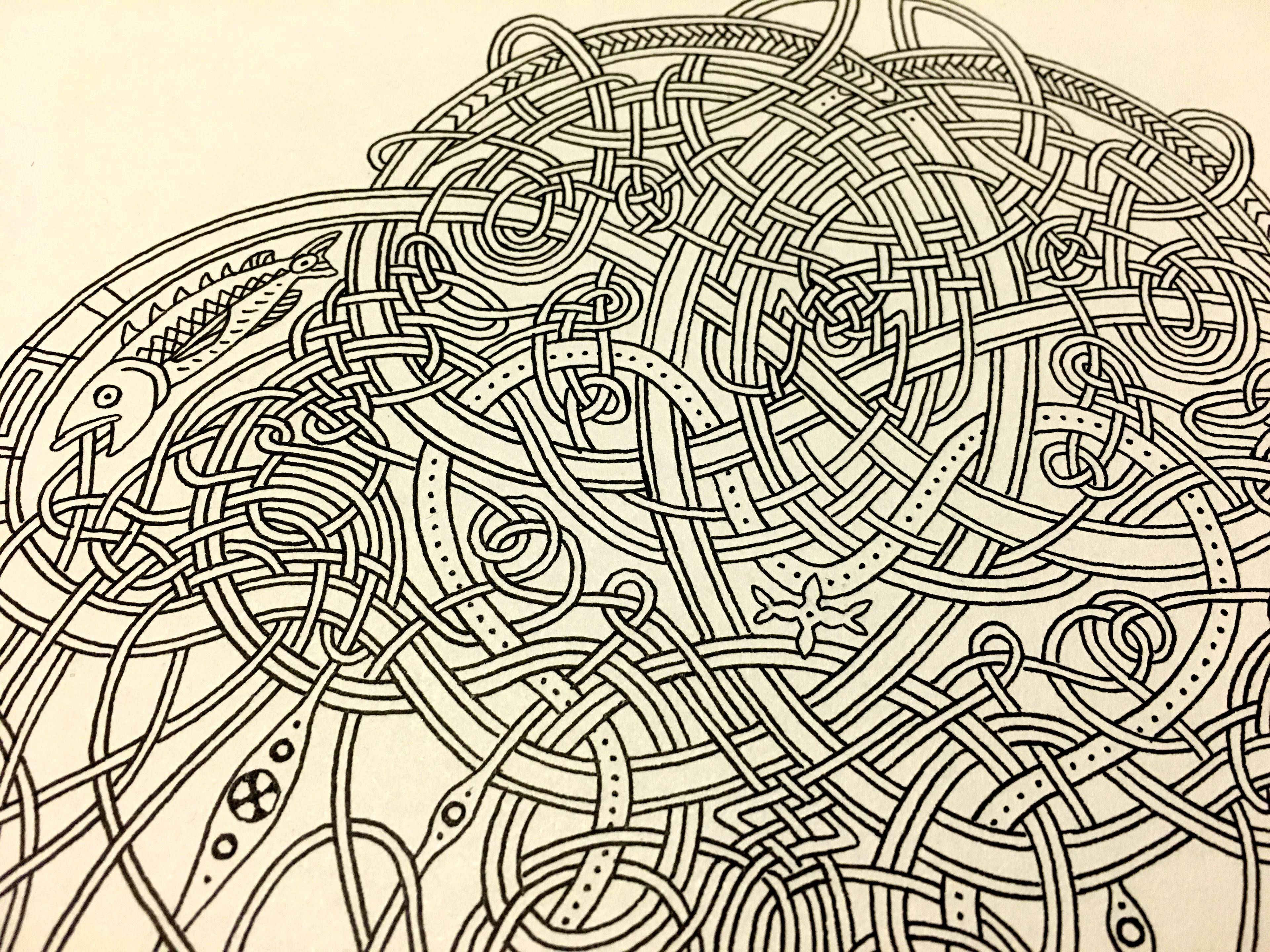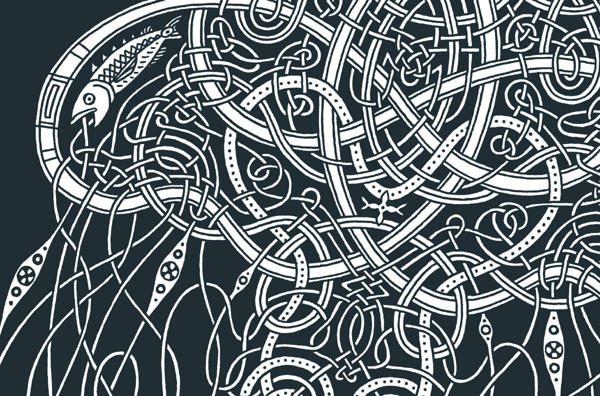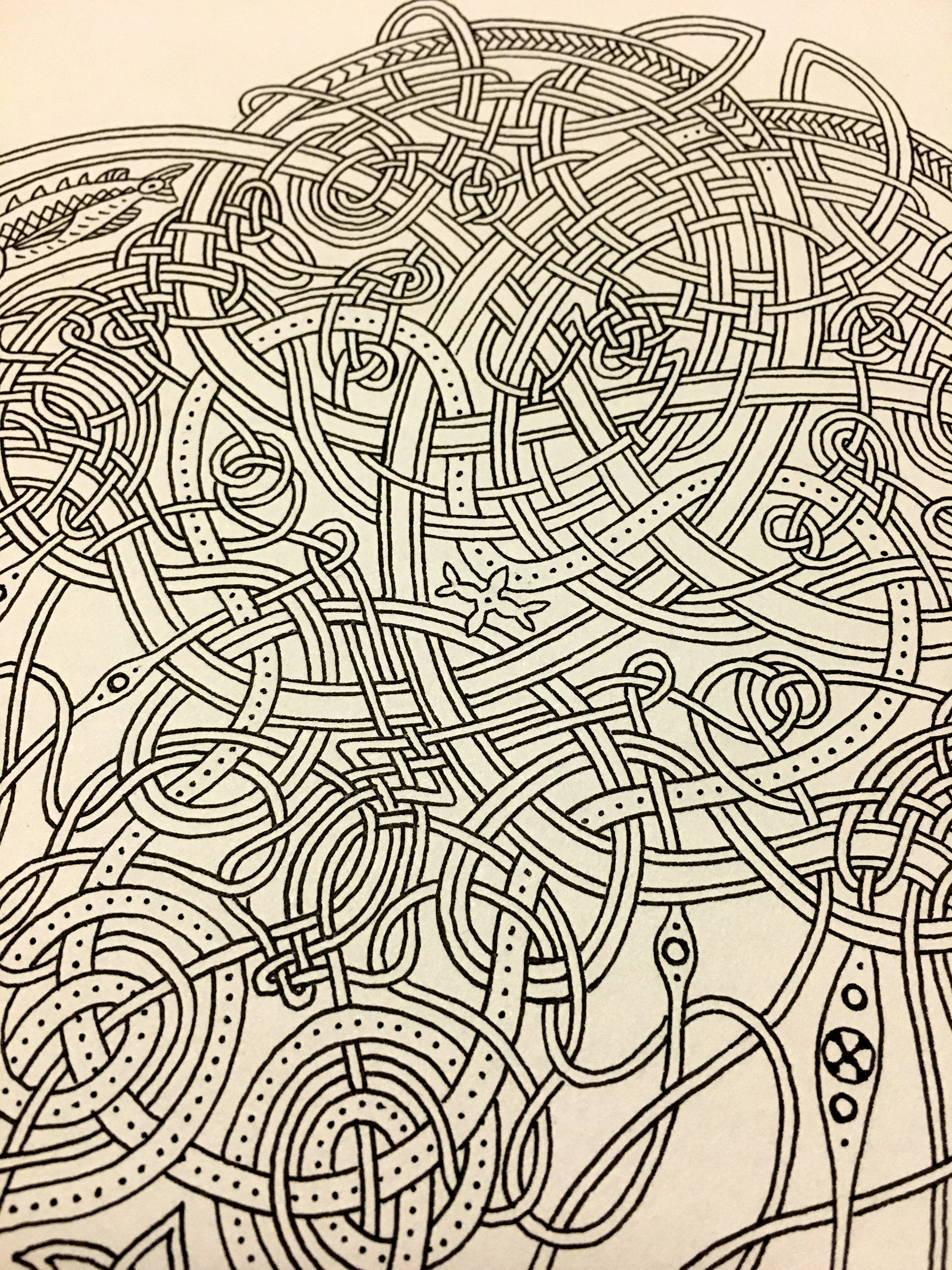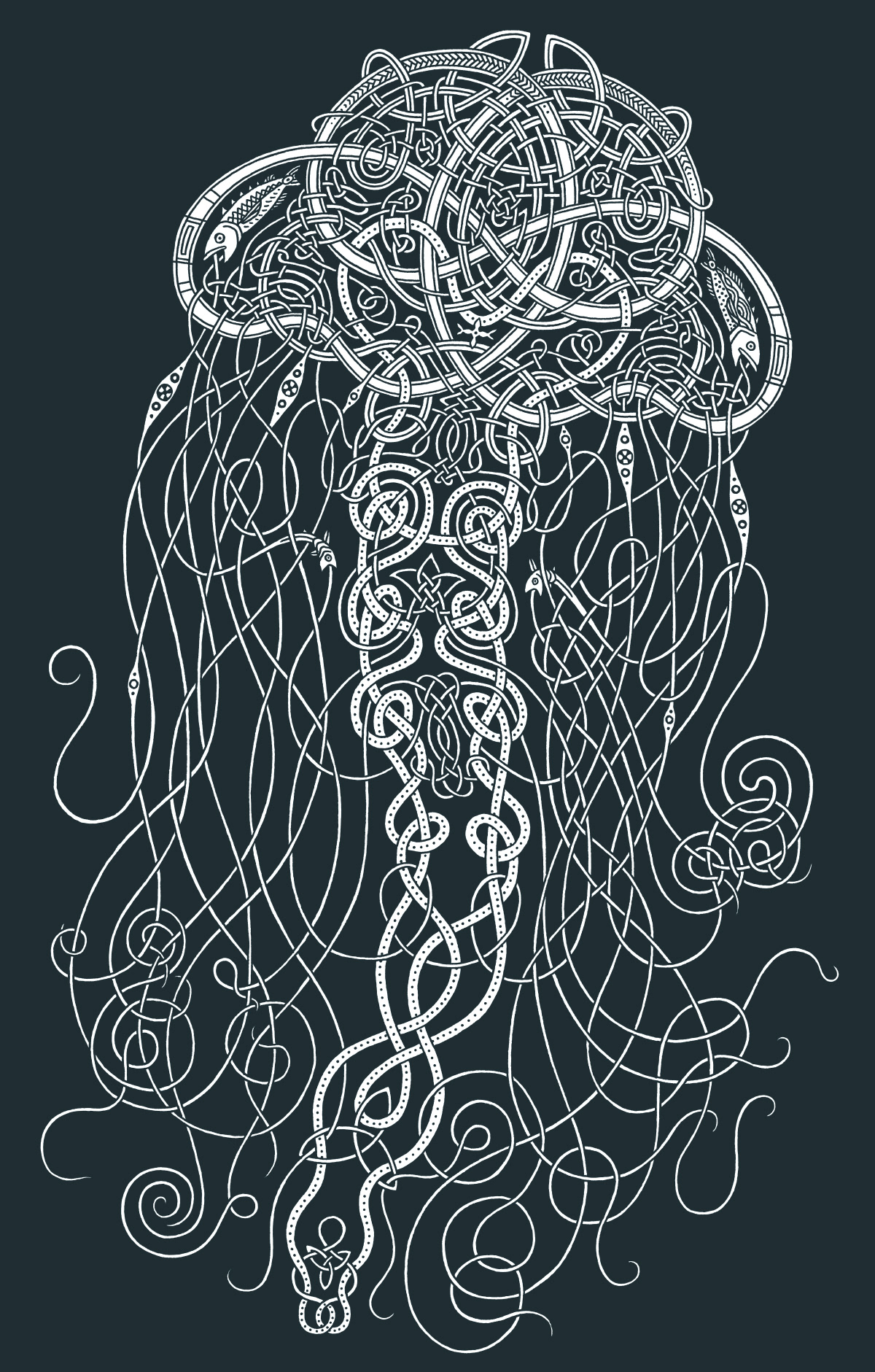 The intricacy of Celtic art applied to one of nature's many intricate creatures, the jellyfish. Drawn in pencil, traced in ink and then augmented in Photoshop. Trace any line and see that each one follows the pattern of over, under, over, under, etc. When creating Celtic art, if you follow the rules, the pattern ALWAYS works out!