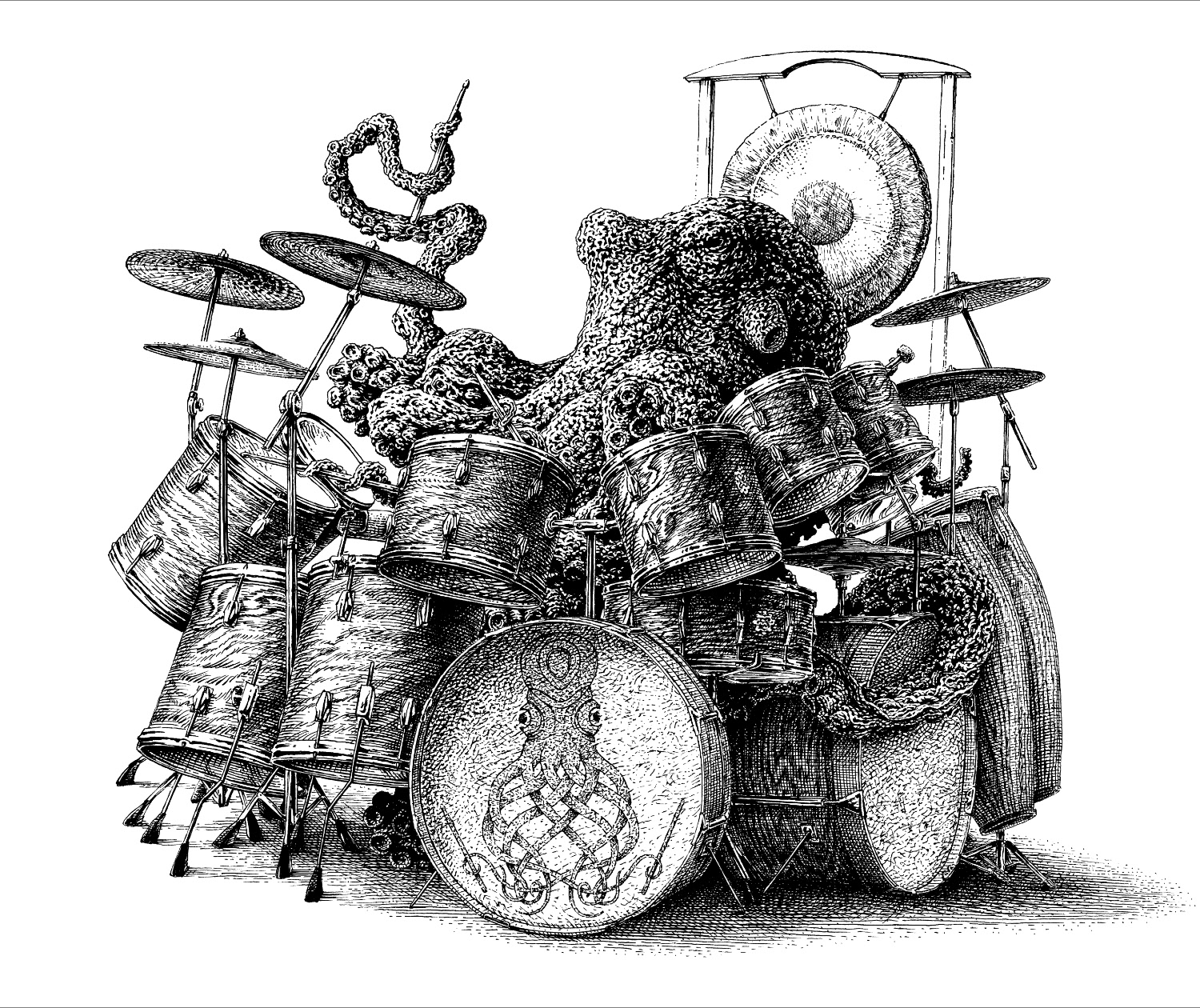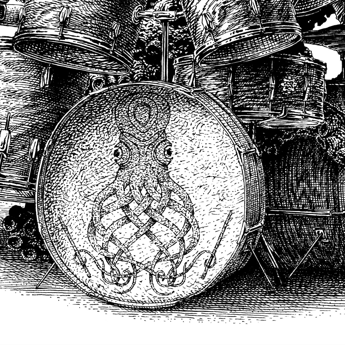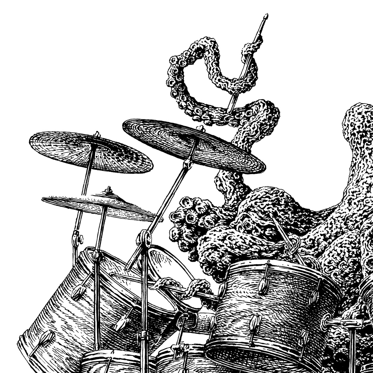 The Octodrummer. He has mad percussion skills-- able to play in multiple rhythms at once but still keep the groove. Ink on paper.